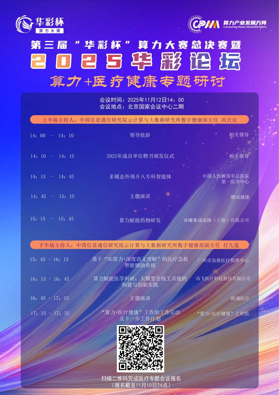 为进一步贯彻落实工业和信息化部等六部门印发的《算力基础设施高质量发展行动计划》,由中国信息通信研究院、中国通信标准化协会、中国互联网协会主办,算力产业发展方阵承办,互联网医疗健康产业联盟、WHO数字健康合作中心、医新苑、沐心数智医疗科技(北京)有限公司、银川市数字介入医学协会协办的2025华彩论坛——“算力+医疗健康”专题研讨会将于2025年11月12日下午14:00在北京国家会议中心二期召开,会议将邀请专家学者、行业领先企业代表参会,分享“算力+医疗健康”领域的最新动态与创新成果,谋划“算力+医疗健康”产业发展新路径。