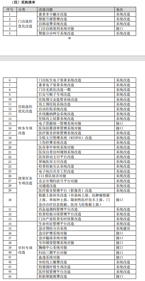 本项目含五大类45项系统或接口建设,均为医院各项重点工作推进过程中的信息 系统建设和改造。其中,门诊流程优化改造旨在提升门诊服务效率,通过推行多卡融 合、智能分诊叫号等具体措施,改善患者就医体验,规范诊疗秩序;住院流程优化改 造聚焦简化住院手续,便于患者完成缴费结算,有效提升住院管理效能;财务专项改 造实现票据管理、医保结算等环节的规范化,降低财务风险,提高整体工作效率;政 策任务专项改造确保医院合规运营,满足相关政策要求,规避违规风险;学科专项改 造为学科发展和运营管理提供技术支撑,助力提升医院整体医疗水平与运营效率。