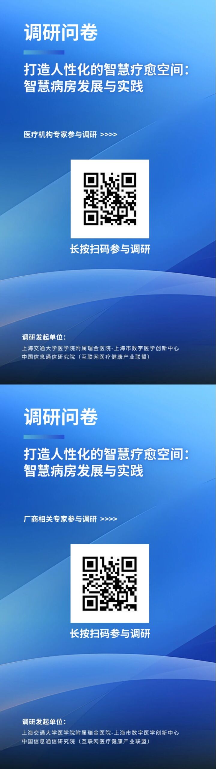 为了探索智慧病房的发展生态,更好地推动智慧病房建设,上海交通大学医学院附属瑞金医院上海市数字医学创新中心联合中国信息通信研究院依托互联网医疗健康产业联盟共同开展智慧病房发展与实践调研工作,探索智慧病房建设所需技术体系,提炼住院病房、ICU病房、研究型病房等各类智慧病房典型应用场景和落地顺序,找准影响智慧病房建设的建设挑战及未来展望。在此,我们诚挚邀请您积极参与并填写调研问卷!